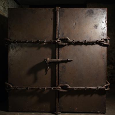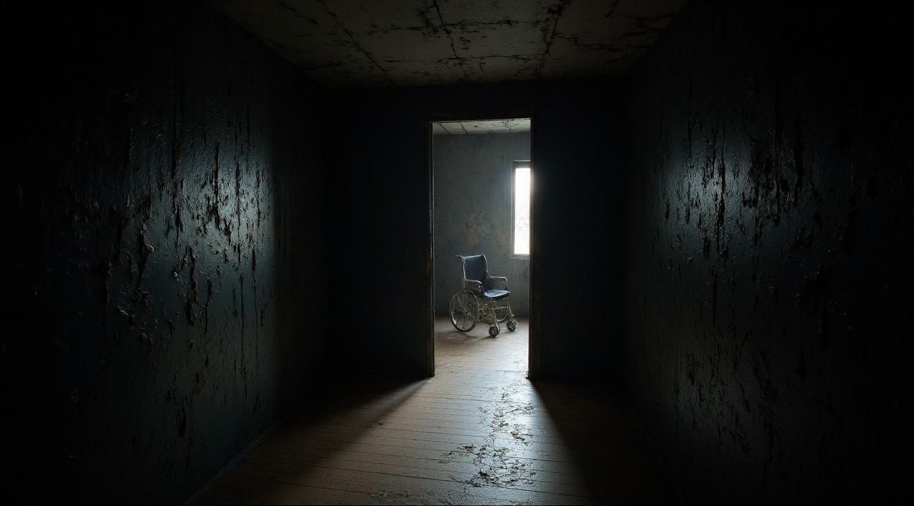 Фотореалистичная хоррор-сцена: узкий заброшенный коридор старого дома с облупленными чёрными стенами, грязными текстурами и деревянным изношенным полом, сильная перспектива вглубь. В конце коридора полуоткрытая дверь, за ней тёмная комната. В комнате — инвалидная коляска, частично освещённая холодным слабым светом. В коляске — искажённая фигура человека в неестественной позе, тёмный силуэт, ощущение угрозы. Минимальное освещение, высокий контраст, глубокие тени, тревожная атмосфера. Кинематографичный кадр, зерно, шум, 35mm, dark cinematic lighting, horror photography, abandoned asylum style.