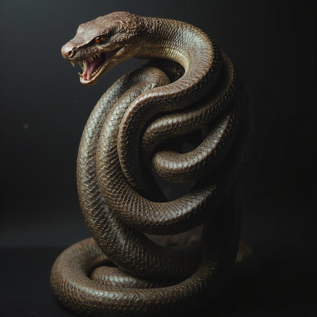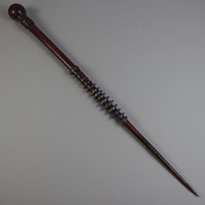Элегантная,но грозная волшебная палочка в стиле Олливандера. Изготовлена из тёмного, почти чёрного дерева ольхи с красноватым подтоном. От рукояти к кончику идёт спиральная резьба, имитирующая витой хвост скорпиона. По всей длине в резьбу вплавлены острые шипы из матового тёмного серебра или воронёной стали. Лежит на фоне чёрного мрамора. Макросъёмка, фотореалистично, контрастное боковое освещение, атмосфера безжалостной власти и непреклонной воли.