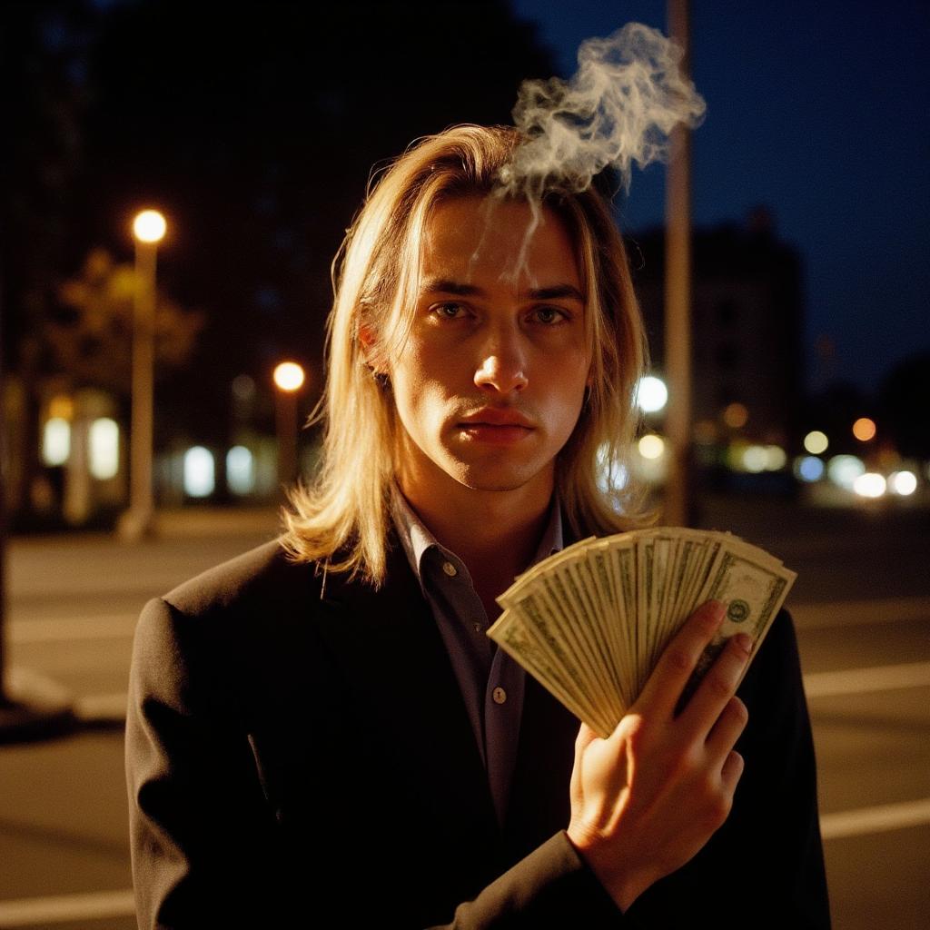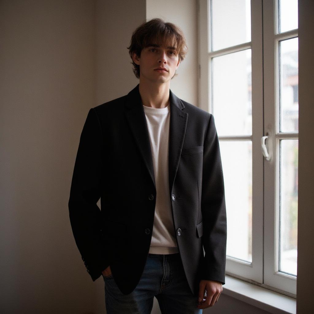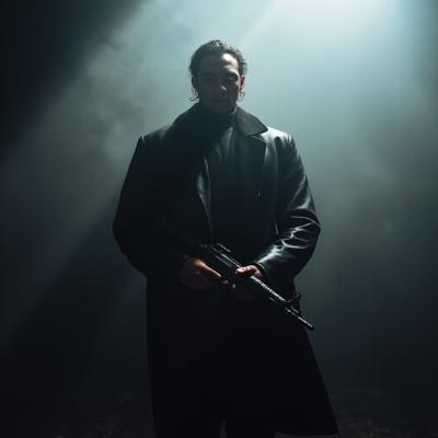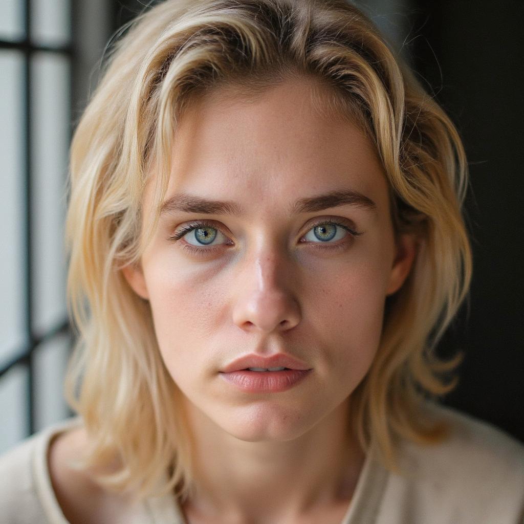 Кпоп айдол 14 лет с милой внешностью. У нее черные волосы с короткой (выше бровей) челкой, у нее длинные волосы, сзади нее растушеванный фон(железная сетка-стена) . Ее рука лежит на голове, слегка придерживая ее.Также у неё есть пирсинг носа. Она одета в черную кожанную куртрку с ввсоким воротником , ее видно лишь до половины груди, , Она должна выглядеть как реальнвй девушка четырнадцати лет, У нее темно синий маникюр, Она должна выглядеть очень крутой, у нее лицо без эмоций, , Ей 16 лет