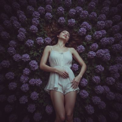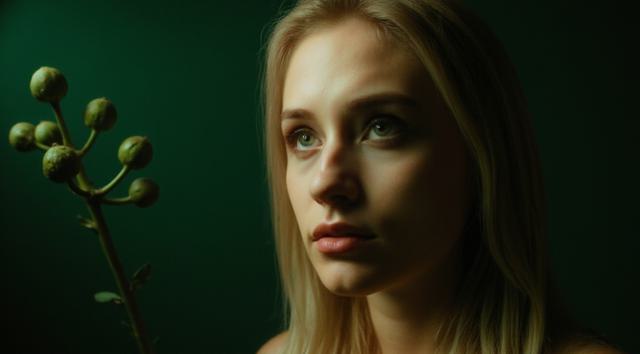 Стильное фото для обложки. Ближе к правой стороне из темноты слегка выступает лицо симпатичной молодой девушки со светлыми убранными волосами. Черты лица в тени и только самые яркие детали высветлены. Общий фон нежно зелёный. Справа на лево фон плавно затемнён. По углам фото много крупных бутонов и цветов. Нежные тона, мягкий свет.