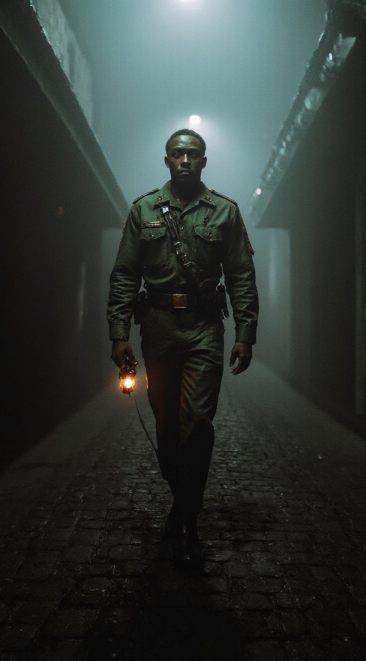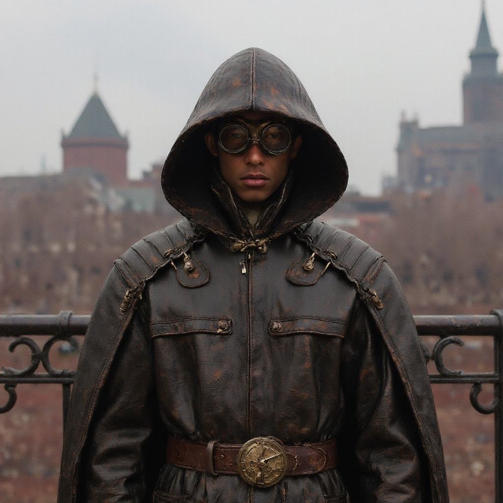 Steampunk plague doctor wearing a detailed steampunk outfit with a high-collared coat, leather straps and buckles, intricate clockwork embellishments, a hooded cape or cloak with a large, weathered leather hood, goggles on the forehead, and a mask, standing in front of a retro-futuristic cityscape at night, illuminated by neon lights and vintage technology, with a dystopian yet vibrant atmosphere