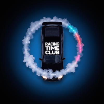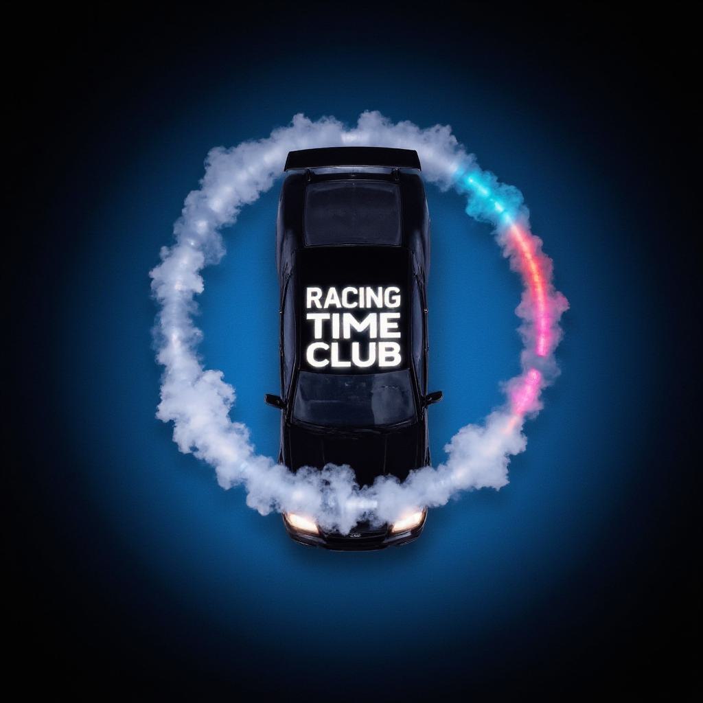 Верх: центрированный текст «Racing Time Club» крупным шрифтом с лёгким свечением/неоновой подсветкой., Центр/круг вокруг машины: дым образует кольцо; , Фон: темно-синий или угольно-чёрный., Неоновые акценты: голубой и красный/пурпурный., Текст: белый с лёгким тенью или неоновым свечением., Дым: серый с синеватым отблеском, полупрозрачность 60–80%.