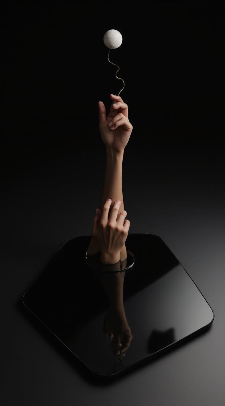 Нейтральный серый темный фон с перспективой, уходящей в даль, слегка бежевого пастельного оттенка. Продукт находится вертикально над серой отражающей поверхностью, оставляя естественные тени и блики на ней. Формат 3:4. Сохранение всех деталей, цвета металла и блеска камней без изменений, только соответственно освещению и обстановке.