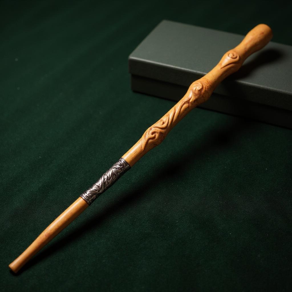 Мастерски созданная волшебная палочка в стиле Олливандера. Элегантная и стройная, из полированной светлой груши с теплым медовым оттенком. По всей длине — сложная резьба в виде плавных водяных волн и завихрений, подчеркнутая тонкими вставками серебра. Лежит на темно-зеленом бархате. Фотореалистично, макросъемка, драматическое боковое освещение, высокая детализация, атмосфера тайны и мастерства.