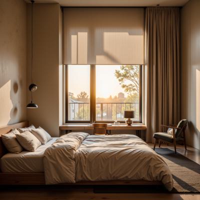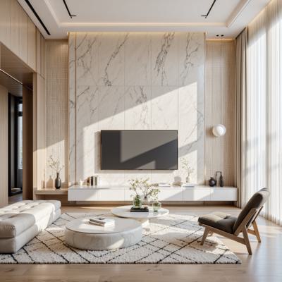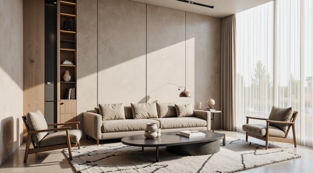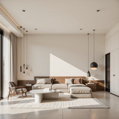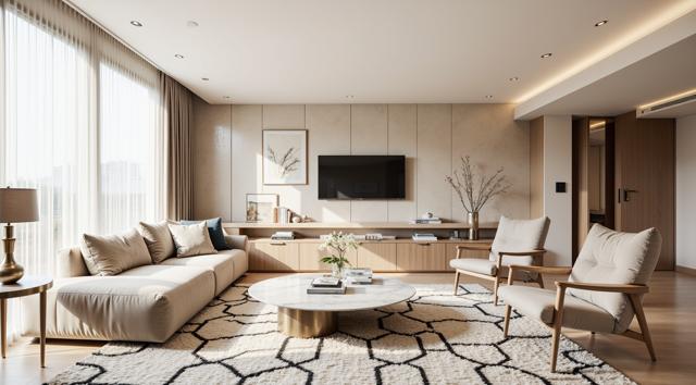 Современная квартира с продуманным интерьером, светлые и уютные тона, минималистичная и стильная мебель, большая гостиная с панорамными окнами, естественное освещение, декоративные элементы, современный дизайн, чистые линии и гармоничные пропорции, простор и комфорт, высокое качество визуализации, реалистичная детализация, без текстов и логотипов,