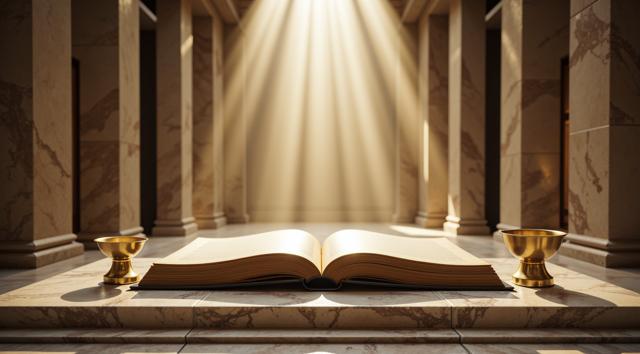 Величественный интерьер античного храма с высокими мраморными колоннами. В центре, на постаменте, лежит огромная раскрытая бухгалтерская книга с пустыми золотыми страницами. Рядом стоят идеально ровные весы с золотыми чашами. Лучи торжественного света бьют сверху, освещая книгу. Вокруг легкая дымка. Четкое место для текста в центре композиции. Стиль: классическая живопись, реализм, богатые золотые и белые тона, кинематографичный свет, высокая детализация, широкий формат.