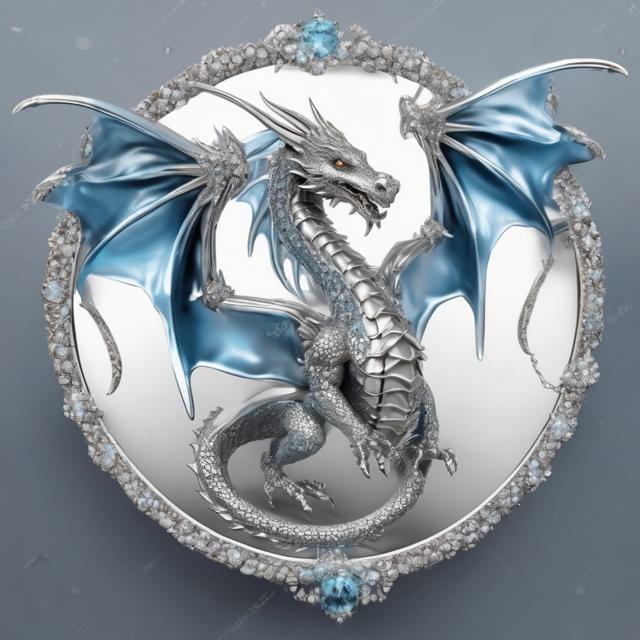 на белом фоне круглая рамка, ее обвивает серебяный голубой изящный блестящий серебряный металлический украшенный бриллиантами крылатый дракон с длинным хвостом