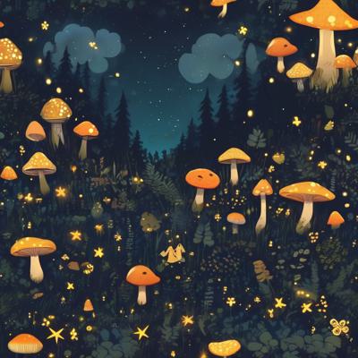 Летняя ночь в лесу на поляне светлячки грибы звезды