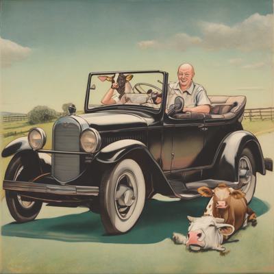 Лысеющий человек в кабриолете с коровой