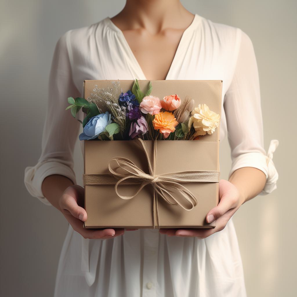 Руки держат много картин, упакованных в крафт бумагу с атласными лентами. Фото реализм. 4к