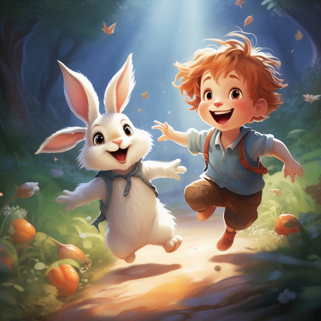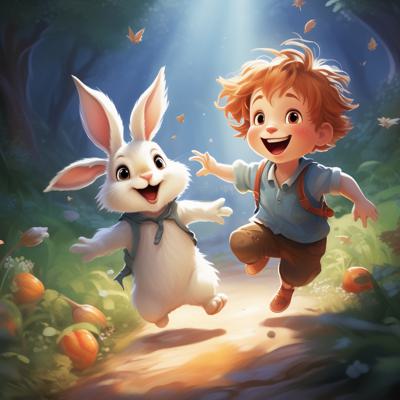 Главный герой сказки мальчик трёх лет, прыгает высоко со своим другом большим зайцем через лес, с ветки на ветку, у них запасы из сумки вываливается морковка, мальчик светло рыжий и светлой кожей, смеются, а кролик в это время успевает ловить морковку и есть ее
