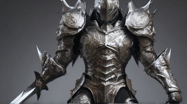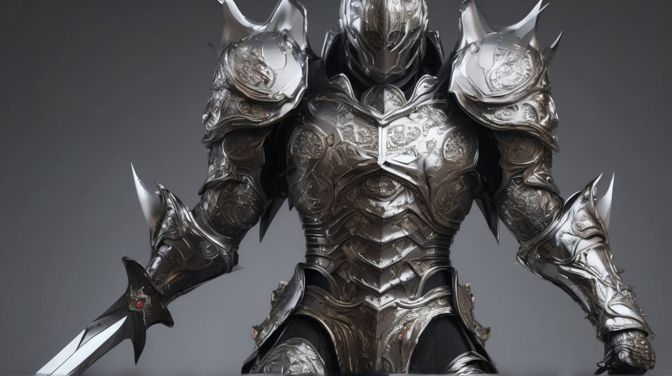 Владыка в серебрянных доспехах будущего стоит с мечом на чёрном фоне в полный рост, высокая детализация