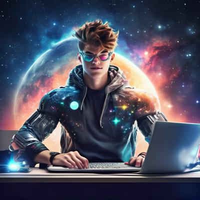 Кибер крутой накаченный подросток за компьютером, очень эпичный и сильный человек, будущее, очень умный, на фоне космоса и звезд, ярко