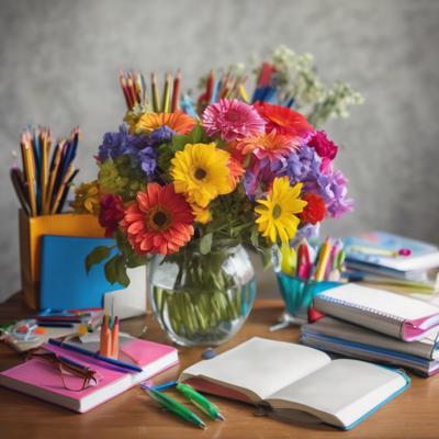реалистичное фото: яркий букет в вазе, на заднем плане школьные принадлежности (тетрадки, книги, глобус)