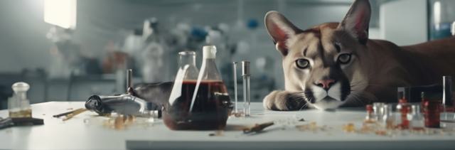 Пума, собака со свисающими ушами чёрная и кошка в лаборатории, в лаборатории хаус, проводятся аналитические и взрывные эксперементы