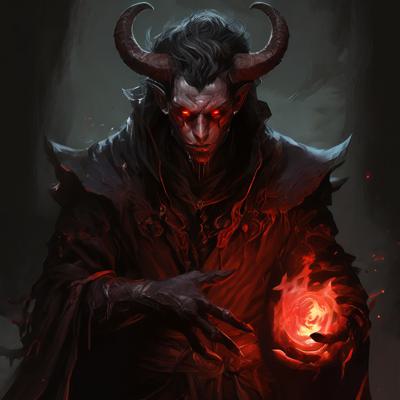 тифлинг, демонический человек, двуногий, колдун, красные глаза, тип реалистичный, серпы в руках, 25 лет.,