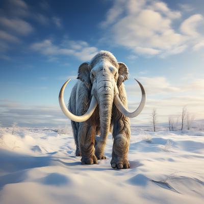 Ямальский мамонт с красивыми бивнями идет по заснеженной тундре. Цвет белый, голубой, синий, бежевый, немного коричневого.