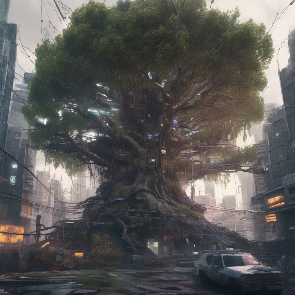огромное киберпанковское дерево с березовой листвой и технологиями вокруг