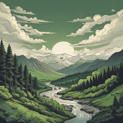 чёрные горы среди зелёных лесов и рек. Горит солнце
