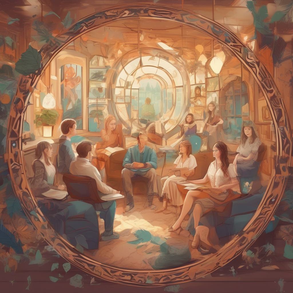Создай картинку в стиле фентази, работа супервизионной группы по психологии в кругу в тёплой уютной атмосфере