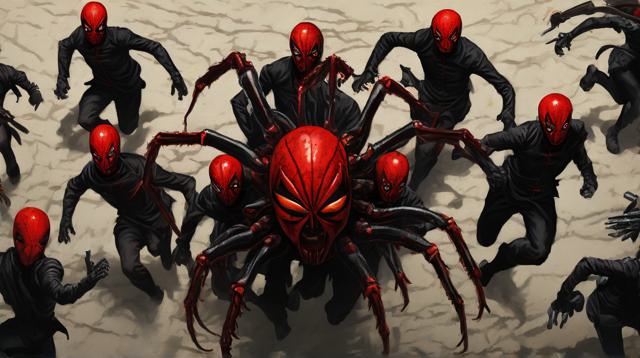 Банда реданов (людей в чёрной одежде, у которых красный паук на спине) бежит вид сверху
