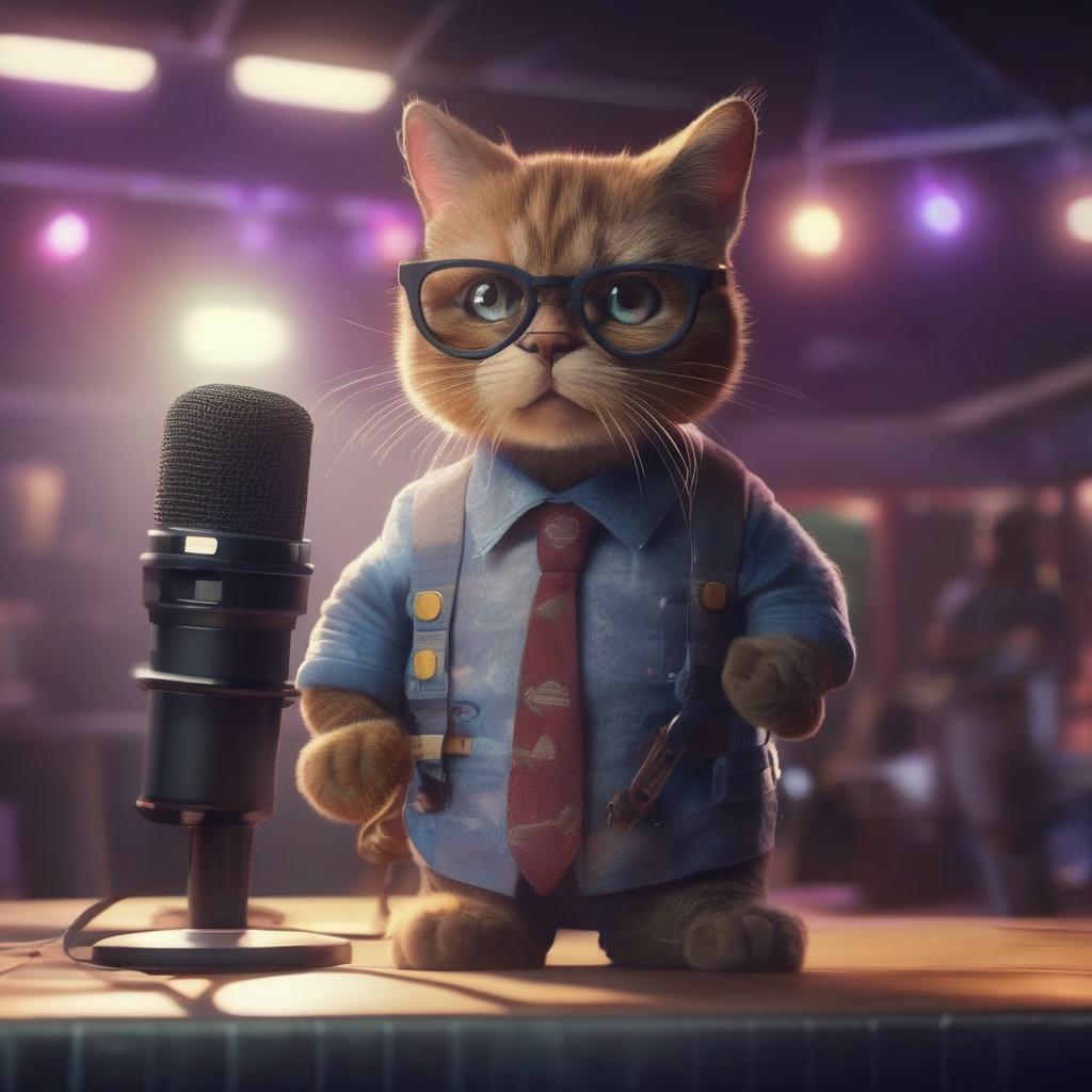 кот стоит на сцене с микрофоном, одетый в очки и рубашку, сзади него расположена доска с компьютерной графикой