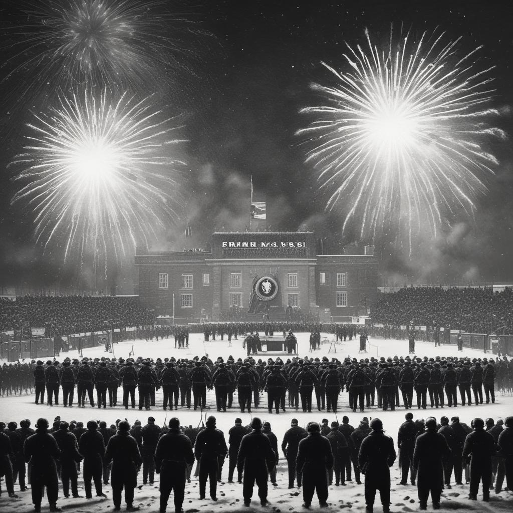 Дивизия СС стоит перед трибуной,идёт снег и запускаются фейерверки