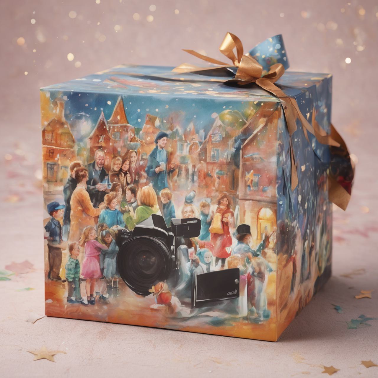 подарочная коробка, на которой нарисованы новый год и фотограф фотографирует счастливую семью
