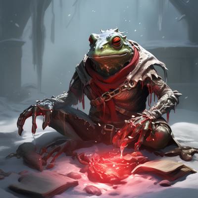 Лягушка была закована в красные оковы боли (это заклинание некромантии) и освободилась с помощью заклинания криогеннный стазис и тем самым заморозила себя, а оковы разбитые лежат около нее, сгенерируйте в стиле divinity original sin 2