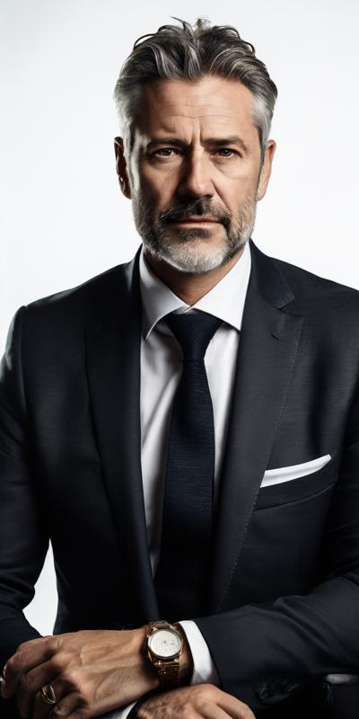фотографично портрет мужчина директор компании 50 лет в дорогом костюме дорогие часы, доход от 5 миллионов в месяц, фон белый,