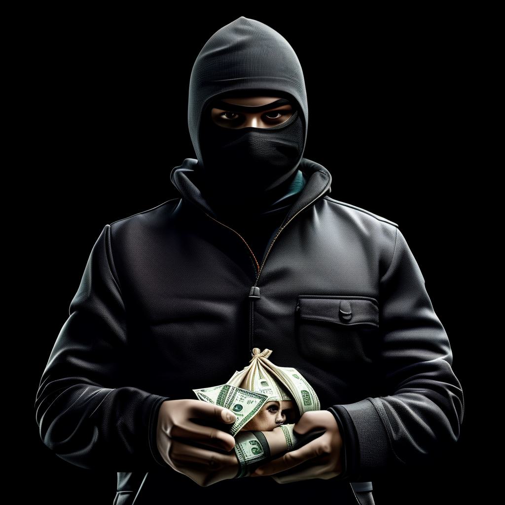 Надпись MAFIA WORK человек в Балаклаве с мешком денег