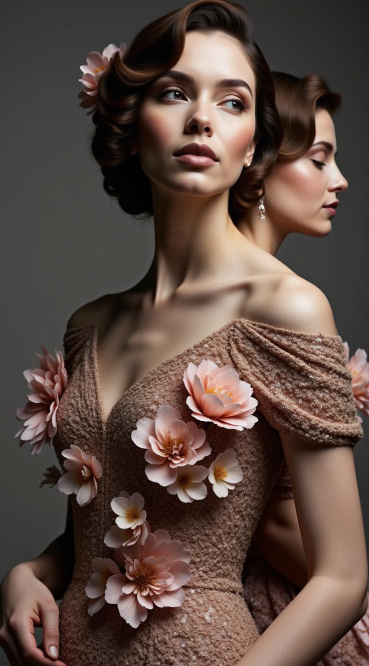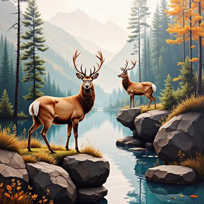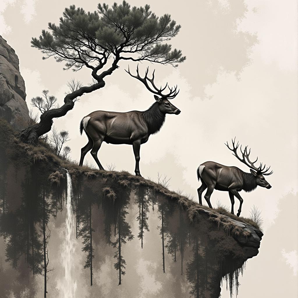 В представленном картине наблюдается сочетание элементов абстрактного импрессионизма и минимализма. Композиция включает образ двух ГИГАНТСКИХ КОСУЛЬ крупным планом, расположенных на фрагменте утёса, на фоне БЕЗ ГОР густого СПЛОШНОГО соснового леса с ручьем. Цветовая палитра ограничена и выдержана в чёрных, серых, светло-коричневых и охровых тонах, что подчёркивает сдержанность и лаконичность стиля, характерного для минимализма, при этом сохраняя эмоциональную глубину и загадочность, присущие сюрреализму и абстрактному импрессионизму.