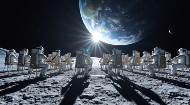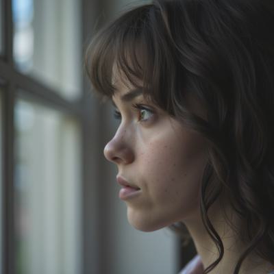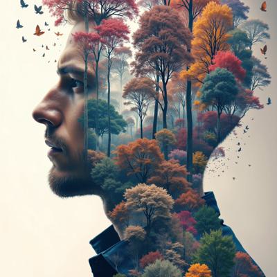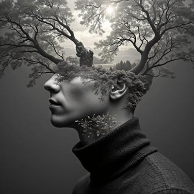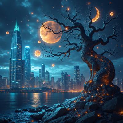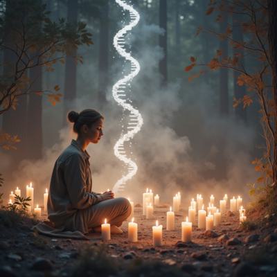 Девушка сидит на земле, полукругом вокруг нее горят свечи над ней через весь горизонт висит спираль ДНК, от нее вдаль уходят две ветви предков: справа выстроены прозрачные белые тени предков по отцовской линии парами мужчина-женщина, в ряд, уходят вдаль по перспективе, зеркально слева от девушки выстроены прозрачные белые тени предков по материнской линии парами мужчина-женщина, тоже уходят вдаль по перспективе, гиперреалистично, фон цвета темный бирюзовый, звезды, космос