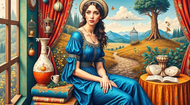 СРЕДНЕВЕКОВАЯ КЛАССИЧЕСКАЯ КАРТИНА. АБСТРАКТНАЯ МНОГОДЕТАЛЬНАЯ живопись в стиле ПОП АРТ ВЕКТОРНОЙ ГРАФИКИ ЖЕНЩИНА КРУПНЫМ ПЛАНОМ СИДИТ В АНФАС В КУПОЛООБРАЗНОМ ГОЛУБОМ ПЛАТЬЕ С ОГОЛЕННЫМИ НОГАМИ ОБЛОКОТИВШИСЬ НА КОЛЕНО С БАТОНООБРАЗНОЙ ПРИЧЕСКОЙ НА ФОНЕ НЕБА И ДЕРЕВЬЕВ ПТИЧЬИХ КЛЕТОК МЕБЕЛИ РАЗНООБРАЗНОГО КОЛЛИЧЕСТВА ВСЕВОЗМОЖНЫХ ПТИЦ , НАТЮРМОРТОВ С ЦВЕТАМИ И ВАЗАМИ С ФРУКТАМИ И ДВУМЯ СОБАКАМИ