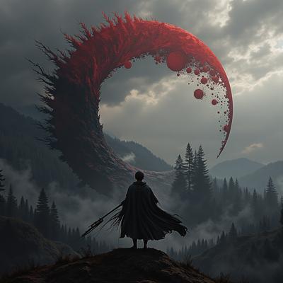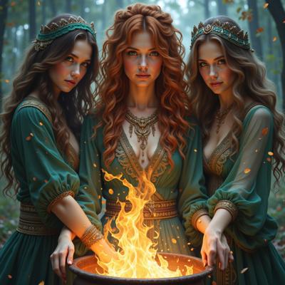 Три сестры ведьмы стоят над котлом Характерные внешность: 1) медь, кудри, голубые глаза; 2) каре, красные волосы, ярко-зеленые глаза; 3) длинные волосы, шатенка, темно-зеленые глаза. Они создают совместное заклинание, вокруг них летают магические руны и энергия. Эпичная композиция, динамичные позы, драматический свет от костра, высокая детализация, 8K.