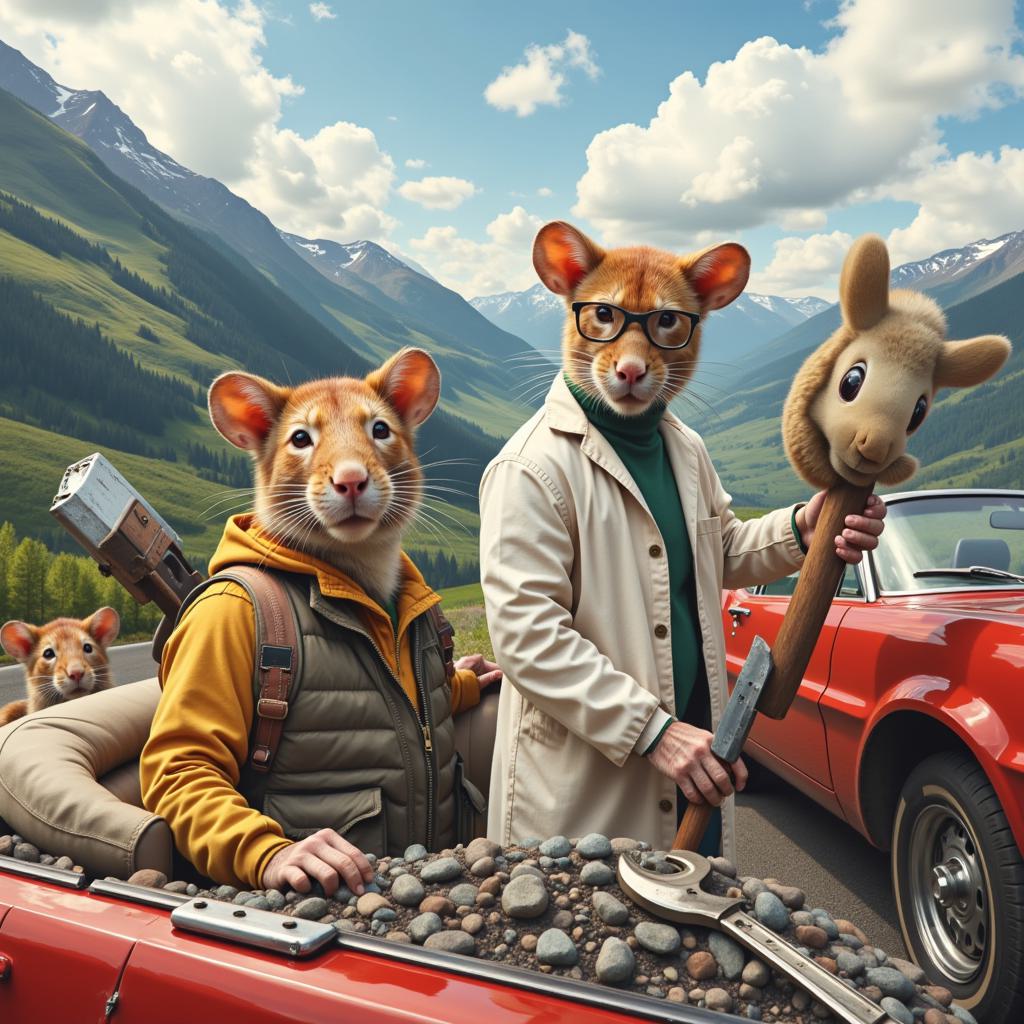Пять крыс на фоне горы — каждая уникальна:, , Лаборант: с белой халатом, очками, держит мешок с блестящими камнями., Железнодорожный рабочий: рыжий, в жилетке, держит молоток, с инструментами за спиной., В очках, за рулём красного кабриолета, уверенно улыбается., С гаечным ключом и маской утки в руках, в рабочей одежде, сосредоточена., В оранжевом костюме грузчика, с тележкой и коробками, дружелюбная