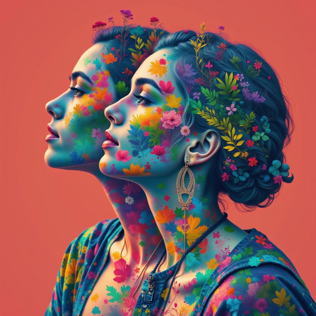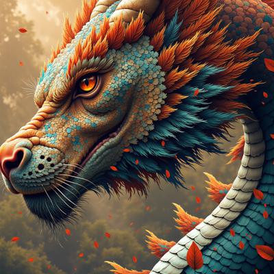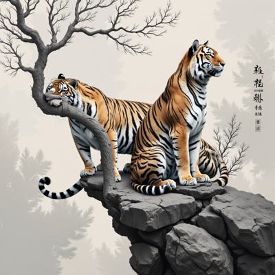 , В представленном картине в цвете наблюдается сочетание элементов сюрреализма, абстрактного импрессионизма и минимализма. Композиция включает образ двух тигров в бодрой позе , расположенного на фрагменте утёса, на фоне ветки бамбуковых зарослей , палитра ограничена и выдержана в чёрных, серых, светло-коричневых и охровых тонах, что подчёркивает сдержанность и лаконичность стиля, характерного для минимализма, при этом сохраняя эмоциональную глубину и загадочность, присущие сюрреализму и абстрактному импрессионизму.