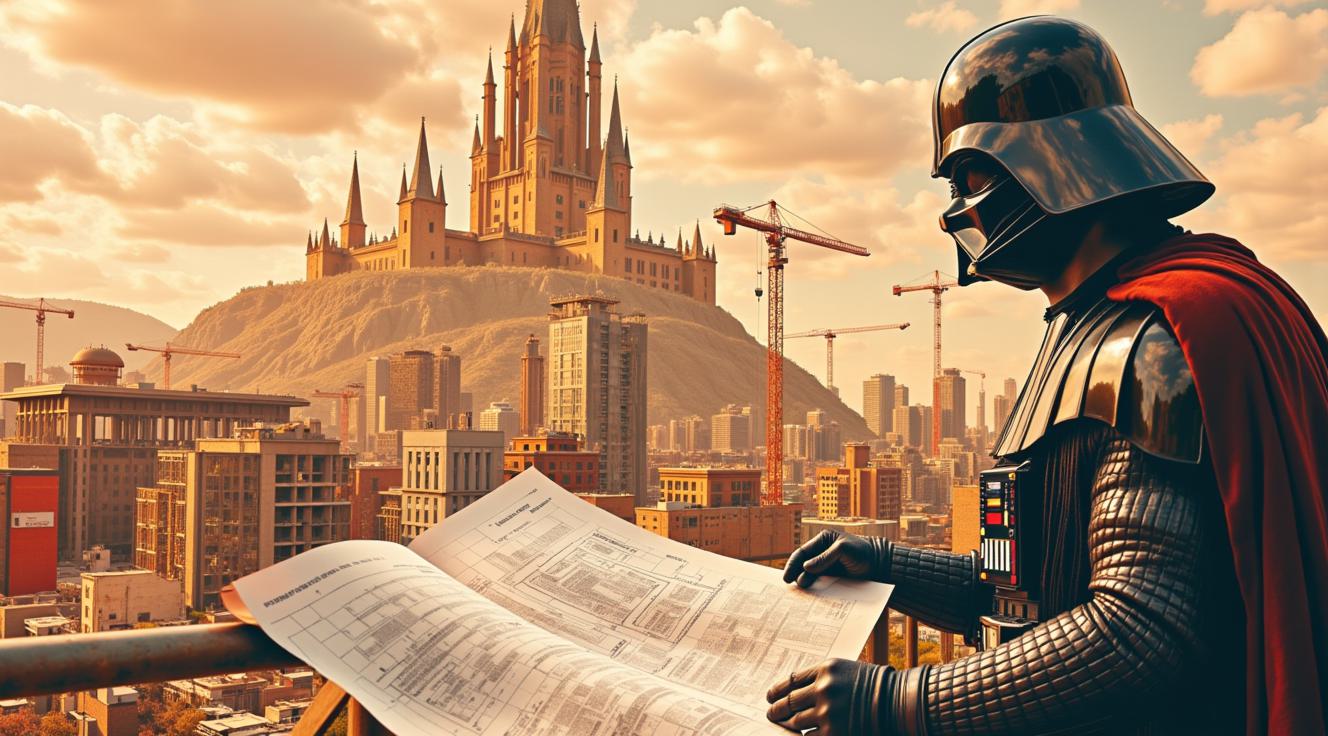 ироничный постер в стиле советских агитационных плакатов 1960-х. Сюжет: Дарт Вейдер, переосмысленный как передовой строитель коммунизма, стоит у кульмана и изучает чертёж города будущего. На заднем плане — типичная стройка эпохи: панельные дома, краны, счастливые рабочие с мастерками. Вейдер выглядит сосредоточенным, будто от его чертежа зависит судьба галактики. Крупная надпись: «Ещё 5 минут — и построим город!!!» — выполнена в стиле лозунгов того времени. Добавь мелкие детали для юмора: табличку «Дарт Вейдер — ударник коммунистического труда», календарь с пятилетним планом, лозунг «Сила в труде!». Цветовая гамма — классическая для плакатов: красный, синий, жёлтый.