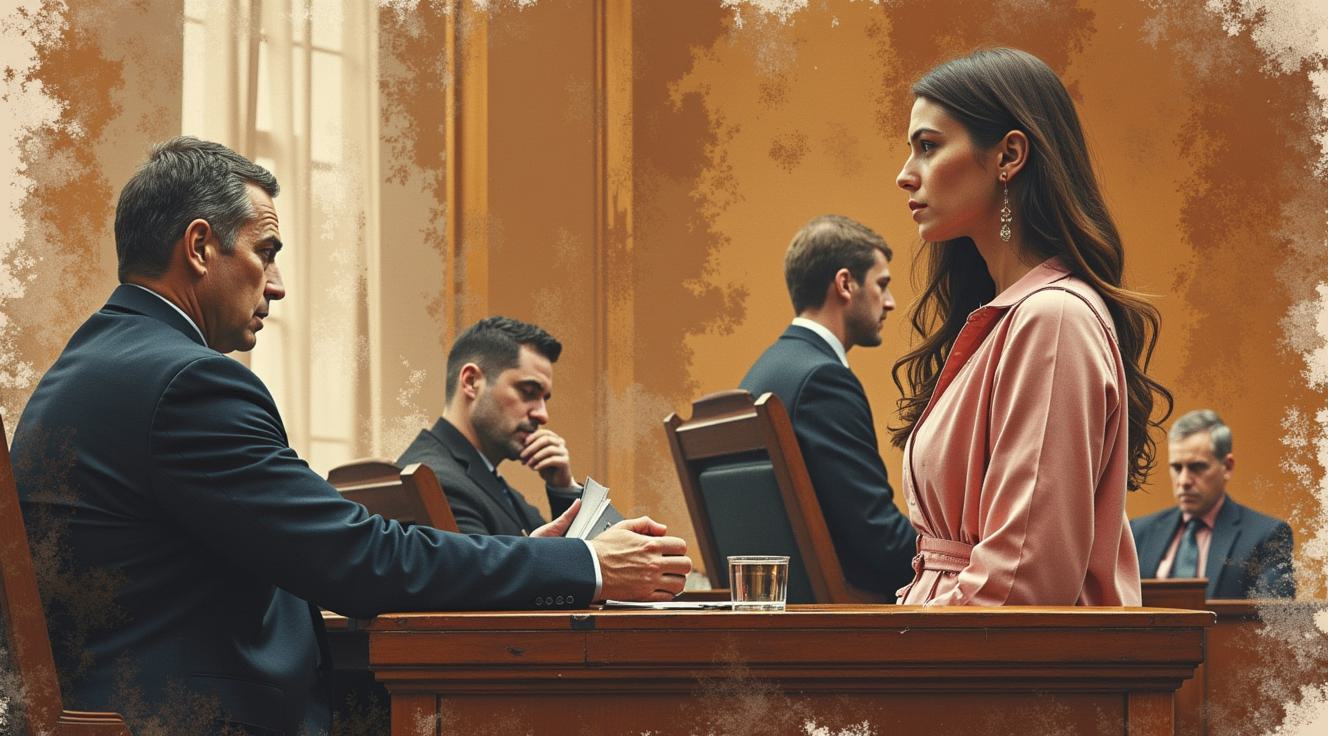 Создайте иллюстрацию, отражающую атмосферу судебного заседания в российском суде по делу молодой женщины Елены Назаровой, обвиняемой в пересылке наркотических средств в особо крупном размере -травы. Изобразите сцену в зале суда: председательствующего судью, государственного обвинителя, защитника и подсудимую, акцентируя внимание на серьезности и важности приговора. Используйте символику правосудия, такие как весы или флаг Российской Федерации, чтобы подчеркивать законность и справедливость. Избегайте насилия и пропаганды наркотиков.