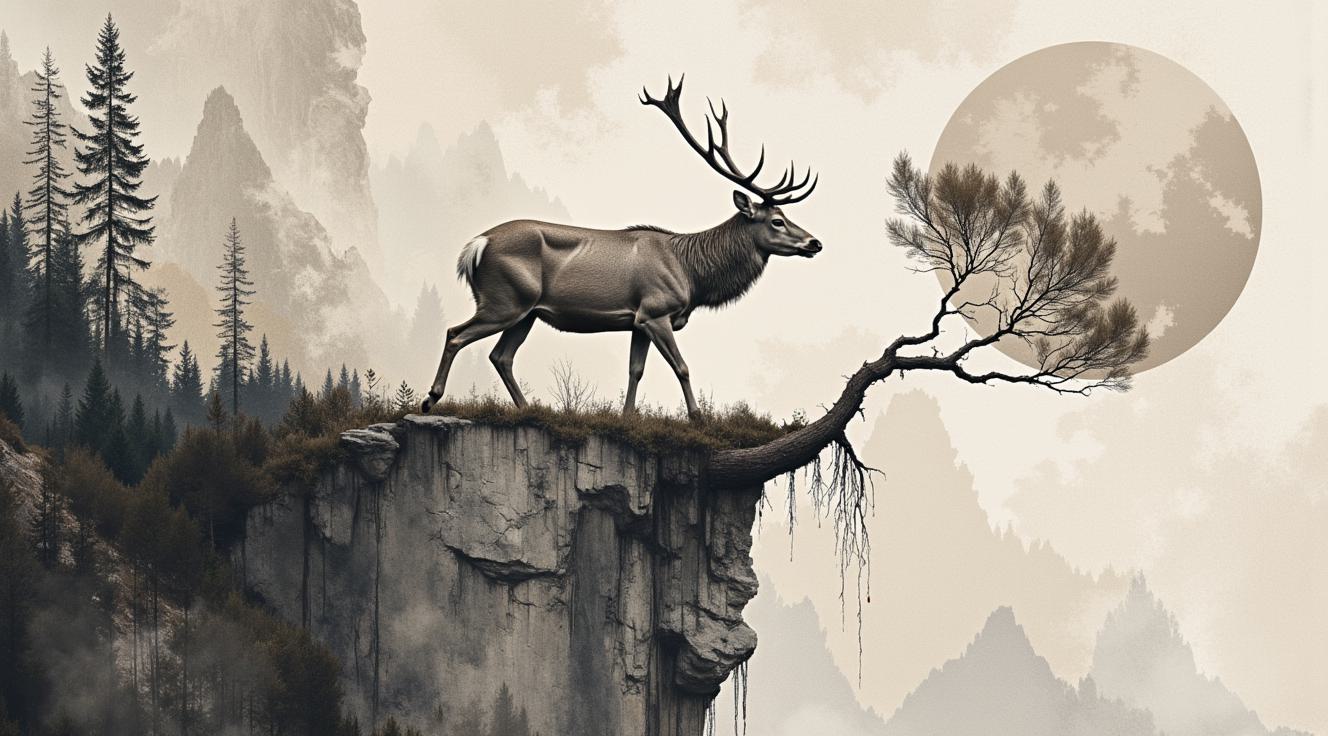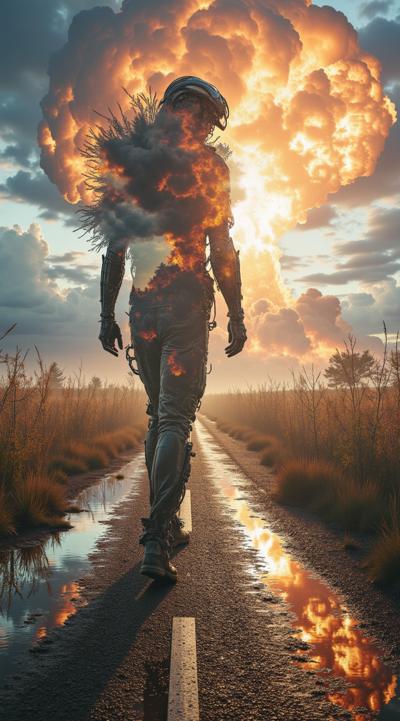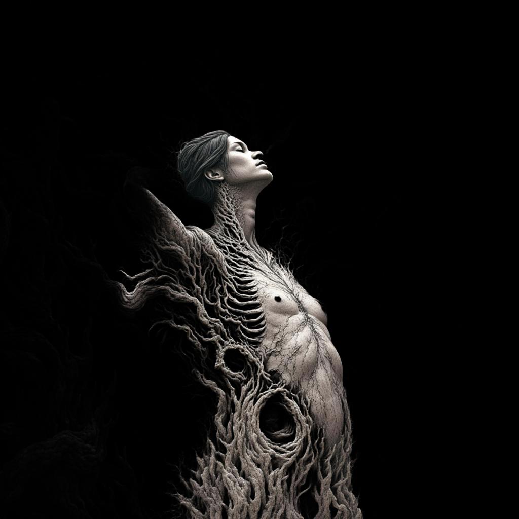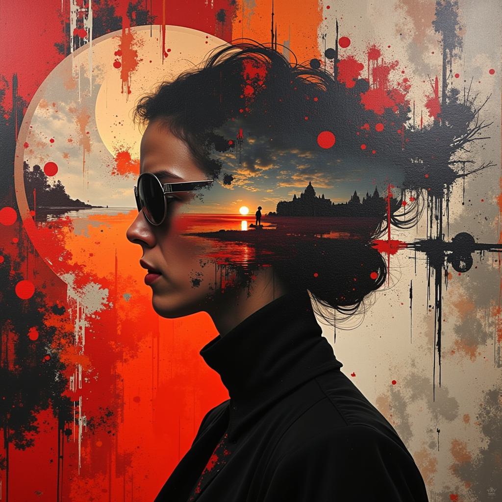 абстрактное произведение живописи, где абстрактные и сюрреалистичные формы, наполненные абстрактными неопределенными фигурами, создают атмосферу киберпанк-мира, но при этом сохраняют элегантность, драматизм и современность, присущие стилю Джека Веттриано, возможно, с оттенком сублимированных эмоций с присутствием коричневых, белых, умбравых, черных, кремовых, оливковых, серых цветов