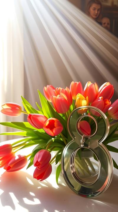 Солнечный луч освещает прекрасный букет тюльпанов на столе. рядом с букетом стоит большая стеклянная цифра 8