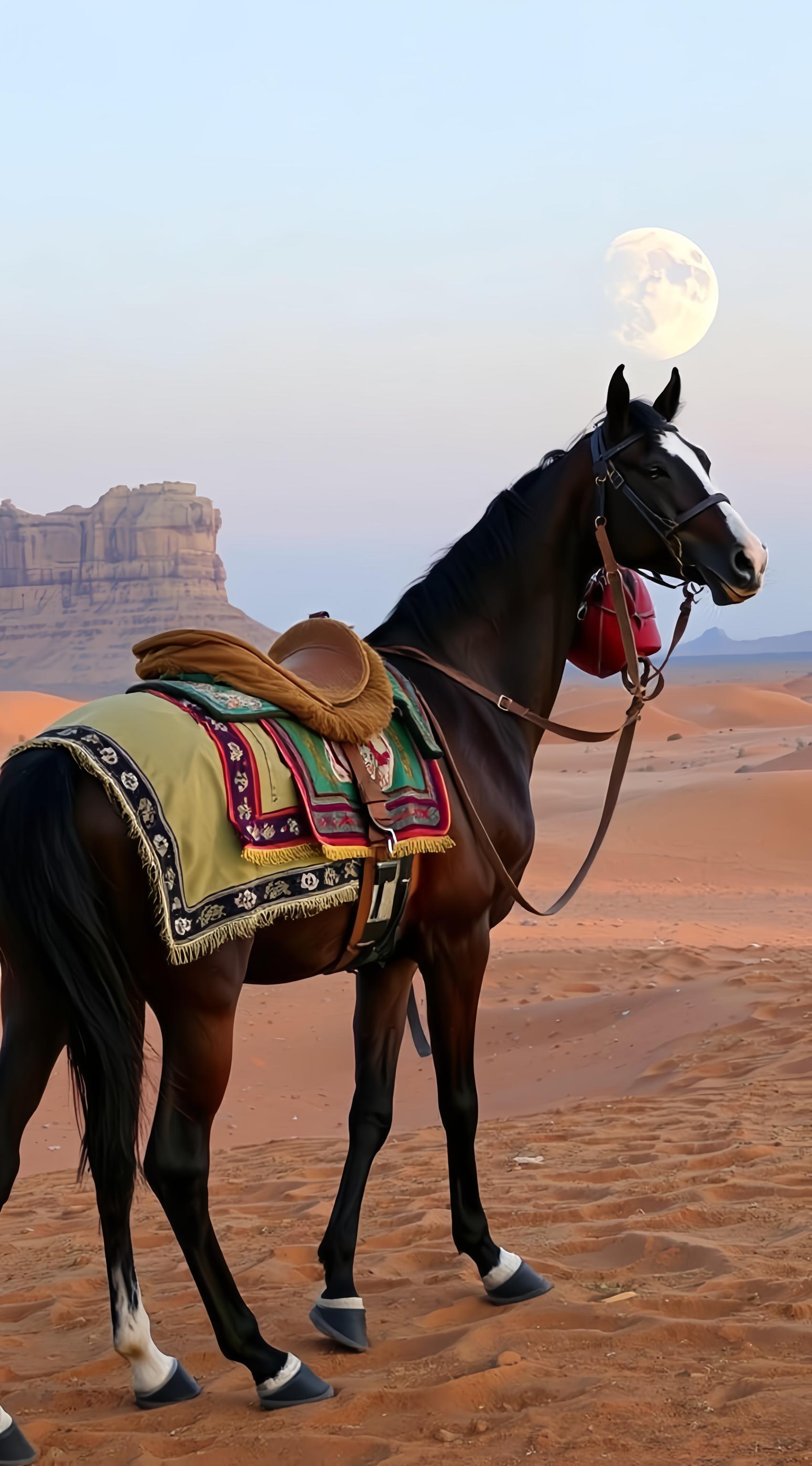 Арабский скакун в полный рост, на заднем фоне убывающая луна и ночная пустыня. Внизу Зульфикар