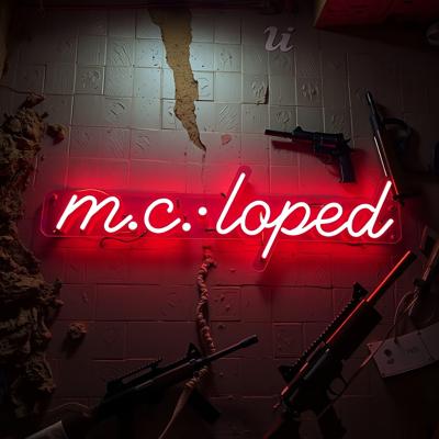 Неоновая надпись "M.C _ Loped" на фоне разрушенной стены и оружия