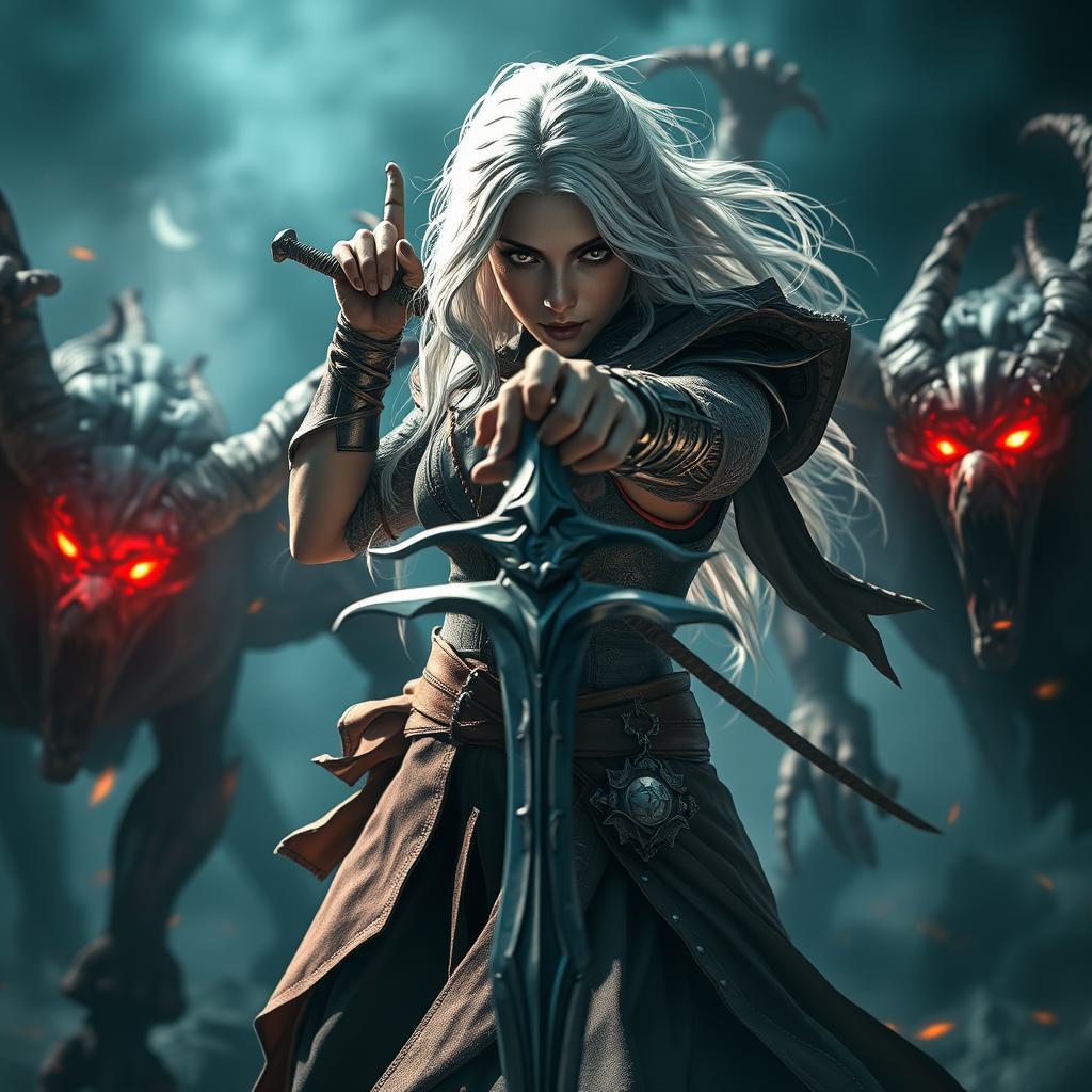 Создайте скриншот из MMORPG, где женщина-волшебница с серебряными волосами бьет мечем по демонам в полный рост стоит лицом к зрителю,