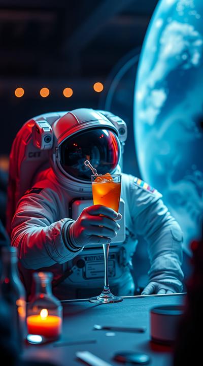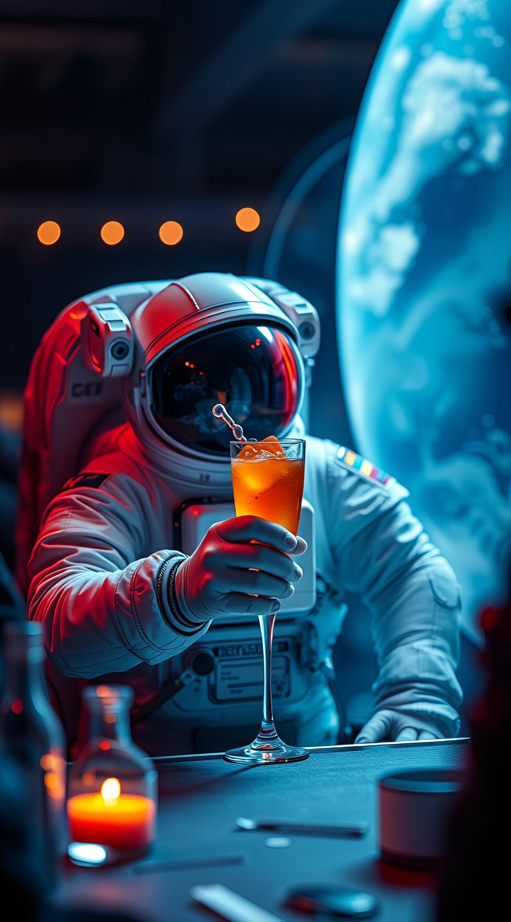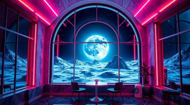 Лунное кафе, по центру огромное окно арочной формы от пола по верха, зеркальные окна, по рамам неоновая подсветка, за окном лунный пейзаж: кратеры, лунные камни, небо звёздное, по центру видна планета Земля, немного светится. , Полы из голубого с серебром мрамора. , Оттенки голубого, фиолетового и серебрянного.