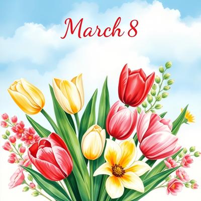 Поздравительная открытка к 8 марта, акварель, букет тюльпанов и мимозы, небо на фоне, верхняя зона чистая под надпись