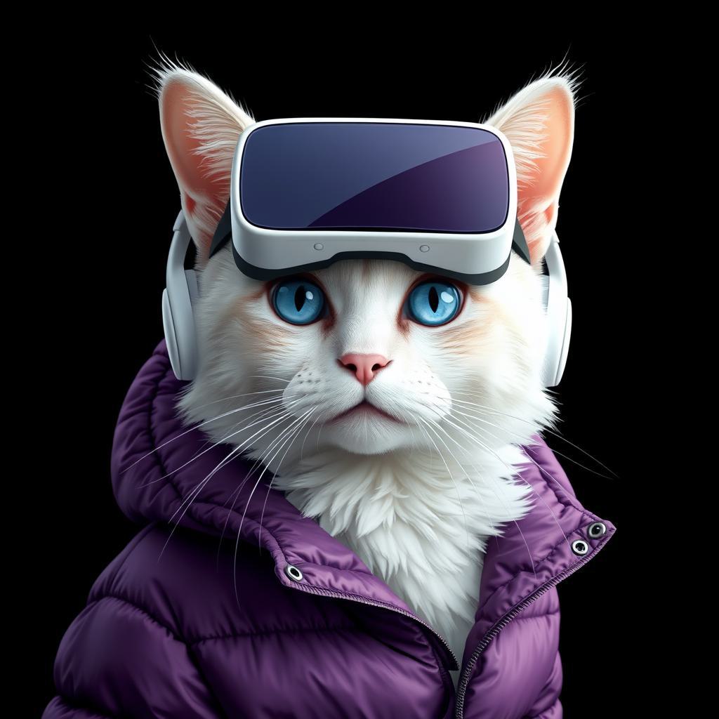 Белый кот, голубые глаза, в фиолетовом пуховике, с VR-очками на голове, белые наушники, черный фон, реализм