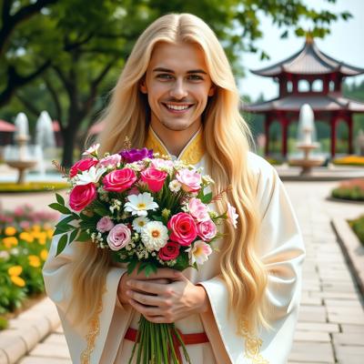 красивый мужчина с длинными светлыми волосами и голубыми глазами держит в руках большой букет цветов, мужчина улыбается, одет в красивый праздничный бело-золотистый ханьфу, задний фон парк с фонтанчиками и беседками, цветами . +Уточнение: сделать волосы длинными