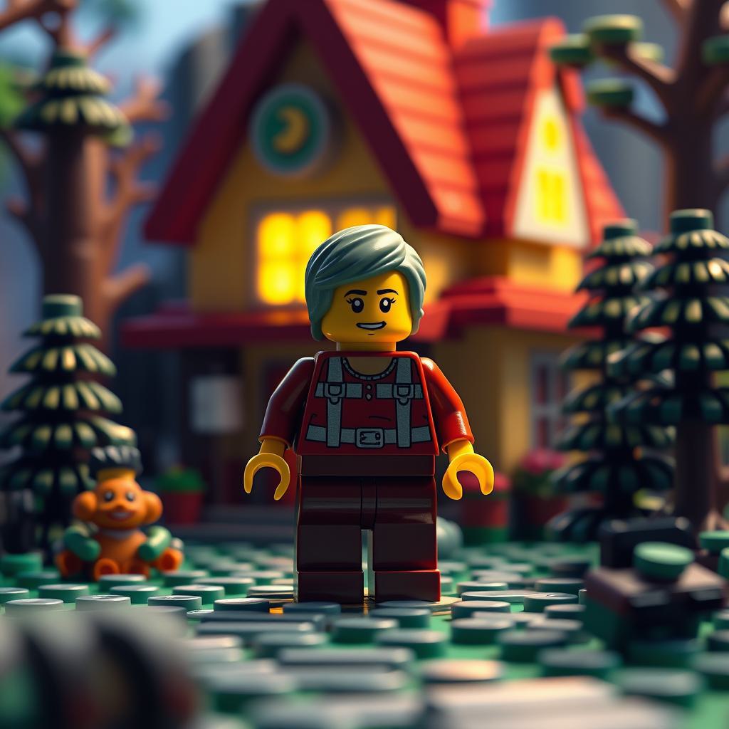 один лего человечек бабушка на фоне лего домика и леса из лего