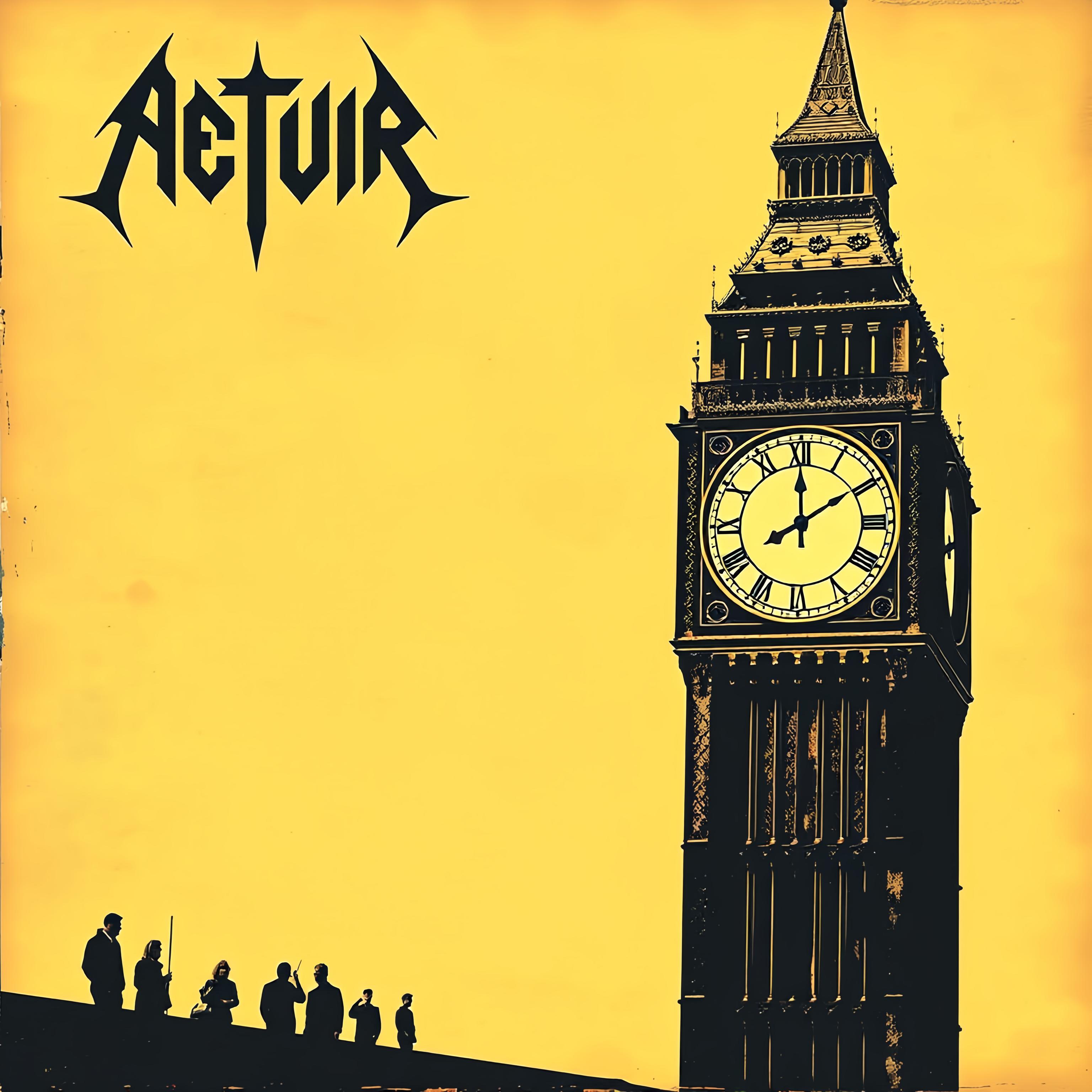Башня с аналоговыми часами, на которых выставленно ровно пять часов, башня стоит в правой трети кадра. В левой части кадра стоят маленькие полуразмытые черные силуэты людей. Палитра песочно-золотисто-чёрная. Обложка металл-альбома.